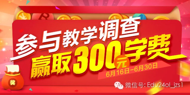 參與方式:在活動(dòng)頁(yè)面注冊(cè)新用戶名,注冊(cè)成功后,回答有關(guān)教學(xué)的調(diào)查問(wèn)卷,即可獲取300元學(xué)費(fèi),學(xué)費(fèi)會(huì)在提交問(wèn)卷后自動(dòng)存到您的用戶中心。