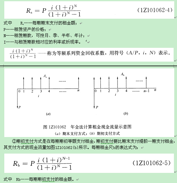 ?、倨谀┲Ц斗绞绞窃诿科谄谀┑阮~支付租金。其支付方式的現(xiàn)金流量如圖1Z101062(a)所示。由式(1Z101012-12)可知,期末等額支付租金計算是等額系列現(xiàn)值計算的逆運算,故由式(1Z101012-12)可得期末支付租金Ra的表達式,即為: