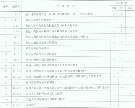 在不同的索賠事件可以索賠的費用是不同的,根據國家發(fā)改委、財政部、建設部等九部委第56號令發(fā)布的《標準施工招標文件》中通用條款的內容,可以合理補償承包人的條款如表1Z103084-1所示。