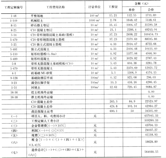 核對(duì)工程量計(jì)算結(jié)果后,利用地區(qū)統(tǒng)一單位估價(jià)表中的分項(xiàng)工程定額單價(jià),計(jì)算出各分項(xiàng)工程合價(jià),匯總求出單位工程直接工程費(fèi)。
