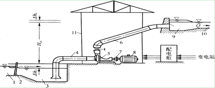 1一水渠;2一攔污柵;3一進水池;4--進水管;5一水泵;6一出水管;