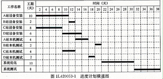 1. 背景:某工程公司承擔(dān)了波分復(fù)用設(shè)備安裝工程,共有四個站,采用包工不包料的承包方式。項(xiàng)目經(jīng)理部計劃安排兩個安裝隊(duì)和一個測試隊(duì)施工,各站的工作內(nèi)容、各施工隊(duì)的施工內(nèi)容、各施工隊(duì)的人員及工具和測試儀表配置、施工階段進(jìn)度計劃如表1l420053-1所示。