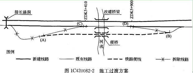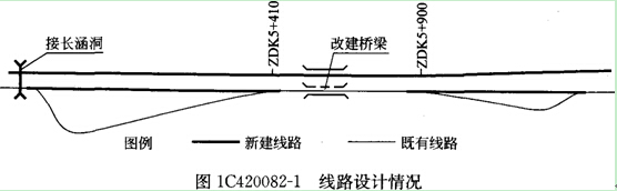 在某鐵路既有線上增建復(fù)線,同時由于鐵路提速,對部分既有線的線型進(jìn)行調(diào)整,施工期間營業(yè)線不得中斷,要保持運營狀態(tài)。圖1C420082―1所示為其中一段的線路情況,由于該段線型不滿足提速的要求,所以設(shè)計時按照取直的方案,其中既有線DK5+410~DK5+900段(與增建二線的里程相對應(yīng))利用,但該范圍既有橋梁需要改建,改建后的橋梁為雙線橋梁(既有橋梁圖中未示出),另外靠左端有一既有涵洞需要接長。