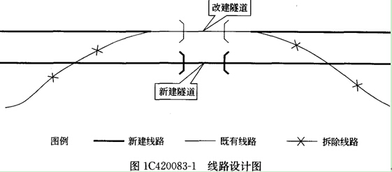 在某鐵路既有線上增建復(fù)線,同時由于鐵路提速,對部分既有線的線型進(jìn)行調(diào)整,施工期間營業(yè)線保持運營。圖1C420083―1所示為其中一段的線路示意,原既有線上的隧道需要改建,同時在新建二線(右線)上增建一座隧道,新建隧道與既有隧道間距為20m,屬小問距并行隧道施工。