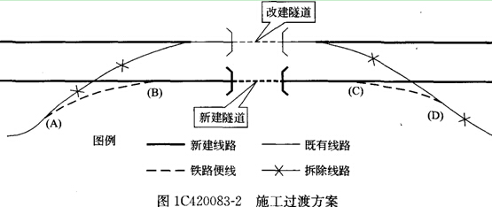 (1)為保證在改造隧道施工中既有線的運營和行車安全,必須采取可靠的施工過渡方案,施工過渡方案如圖1C420083―2所示,根據(jù)圖示理解施工步序。施工步序為: