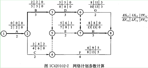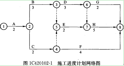 (2)投標(biāo)時(shí)的計(jì)劃工期為13個(gè)月。參數(shù)如圖1C420102―2所示,粗線(xiàn)為關(guān)鍵線(xiàn)路。