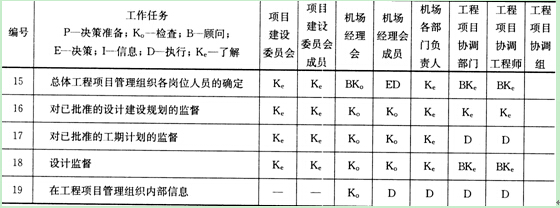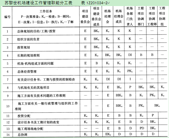 表1Z201034-2是蘇黎世機場建設(shè)工作的管理職能分工表,它將管理職能分成7個,即決策準備、決策、執(zhí)行、檢查、信息、顧問和了解。決策準備與籌劃的含義基本相同。從表1Z201034-2可以看出,每項任務(wù)都有工作部門或個人負責(zé)決策準備、決策、執(zhí)行和檢查。我國多數(shù)企業(yè)和建設(shè)項目的指揮或管理機構(gòu),習(xí)慣用崗位責(zé)任制的崗位責(zé)任描述書來描述每一個工作部門的工作任務(wù)(包括責(zé)任、權(quán)利和任務(wù)等)。工業(yè)發(fā)達國家在建設(shè)項目管理中廣泛應(yīng)用管理職能分工表,以使管理職能的分工更清晰、更嚴謹,并會暴露僅用崗位責(zé)任描述書時所掩蓋的矛盾。如使用管理職能分工表還不足以明確每個工作部門的管理職能,則可輔以使用管理職能分工描述書。