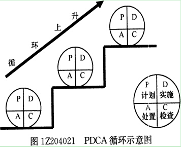 在長(zhǎng)期的生產(chǎn)實(shí)踐和理論研究中形成的PDCA循環(huán),是建立質(zhì)量管理體系和近仃質(zhì)量管理的基本方法。PDCA循環(huán)如圖1Z204021所示。從某種意義上說(shuō),管理就是確定任各目標(biāo),并通過(guò)PDCA循環(huán)來(lái)實(shí)現(xiàn)預(yù)期目標(biāo)。每一循環(huán)都圍繞著實(shí)現(xiàn)預(yù)期的目標(biāo),進(jìn)行計(jì)劃、實(shí)施、檢查和處置活動(dòng),隨著對(duì)存在問(wèn)題的解決和改進(jìn),在一次一次的滾動(dòng)循環(huán)中逐步上升,不斷增強(qiáng)質(zhì)量管理能力,不斷提高質(zhì)量水平。每一個(gè)循環(huán)的四大職能活動(dòng)相互聯(lián)系,共同構(gòu)成了質(zhì)量管理的系統(tǒng)過(guò)程。