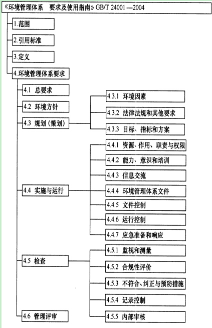 《環(huán)境管理體系要求及使用指南:》GB/T 24001m2004的結(jié)構(gòu)如圖1Z205011-3所示。該標(biāo)準由“范圍”、“引用標(biāo)準”、“定義”和“環(huán)境管理體系要求”四部分組成。 “范圍”中指出,本標(biāo)準旨在其所有的要求都能納入任何一個環(huán)境管理體系。其應(yīng)用程度取決于諸如組織的環(huán)境方針、活動、產(chǎn)品和服務(wù)的性質(zhì)、運行場所的條件等因素。 “環(huán)境管理體系要求”指出了管理體系的全部具體內(nèi)容。