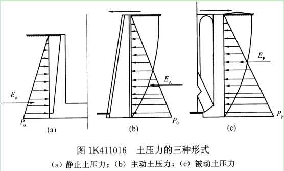 被動(dòng)土壓力(見(jiàn)圖1K411016c):若剛性擋土墻在外力作用下,向填土一側(cè)移動(dòng),這時(shí)作用在墻上的土壓力將由靜止壓力逐漸增大,當(dāng)墻后土體達(dá)到極限平衡,土體開(kāi)始剪裂,出現(xiàn)連續(xù)滑動(dòng)面,墻后土體向上擠出隆起,這時(shí)土壓力增到最大值,稱為被動(dòng)土壓力。