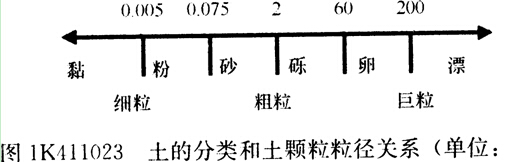 1)土顆粒組成及其特征;土的分類和土顆粒粒徑關(guān)系如圖1K411023所示。