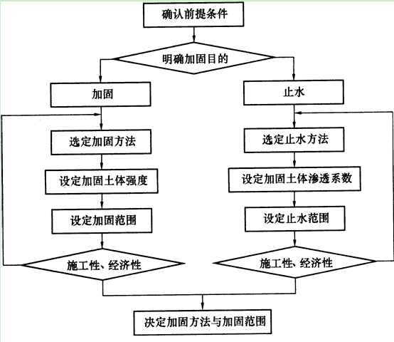 洞口土體加固前,要根據(jù)地質(zhì)條件、地下水位、盾構(gòu)種類與外形尺寸、覆土深度及施工環(huán)境條件等,在明確加固目的后,按照圖1K413033所示程序確定加固方案。