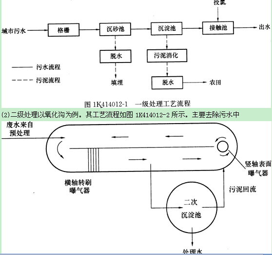 (1)一級(jí)處理工藝流程如圖1K414012-1所示。主要針對(duì)水中懸浮物質(zhì),常采用物理的方法,經(jīng)過(guò)一級(jí)處理后,污水懸浮物去除可達(dá)40%左右,附著于懸浮物的有機(jī)物也可去除30%左右。
