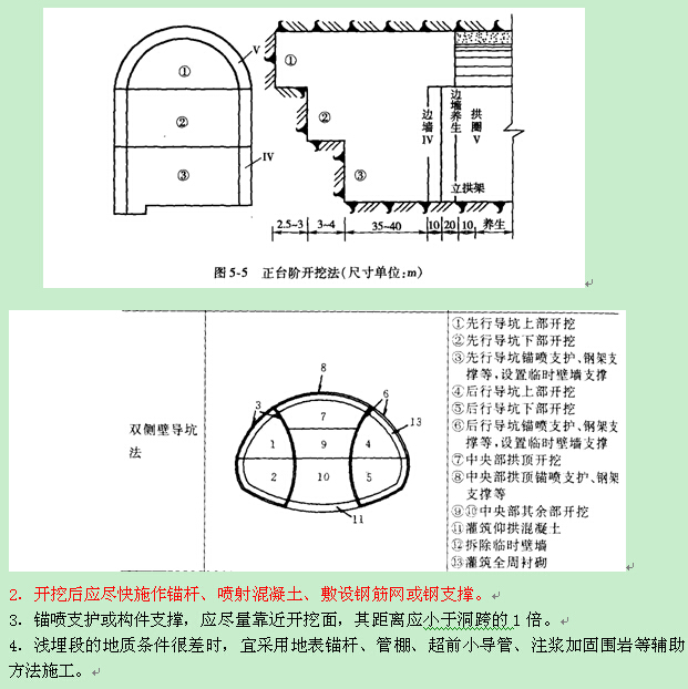 1.根據(jù)圍巖及周圍環(huán)境條件,可優(yōu)先采用單側(cè)壁導(dǎo)坑法、雙側(cè)壁導(dǎo)坑法或留核心土開挖法;圍巖的完整性較好時(shí),可采用多臺(tái)階法開挖。嚴(yán)禁采用全斷面法開挖。