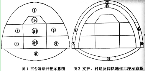 該地段地質(zhì)條件復(fù)雜,勘探表明其圍巖主要為弱風(fēng)化硬質(zhì)頁巖,屬IV~V 級圍巖,穩(wěn)定性差。由于地下水發(fā)育,特別斷層地帶巖石破碎,裂隙發(fā)育,為保證施工安全,施工單位在該遂道施工中采用了超前地質(zhì)預(yù)報(bào),并進(jìn)行監(jiān)控量測。根據(jù)該隧道的地質(zhì)條件和開挖斷面,施工單位在施工組織設(shè)計(jì)中擬采用二臺階法施工,左線隧道施工工序劃分如圖1、圖2所示。