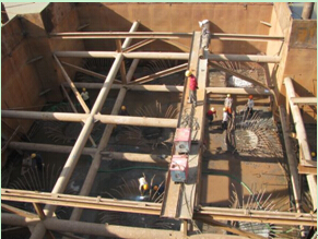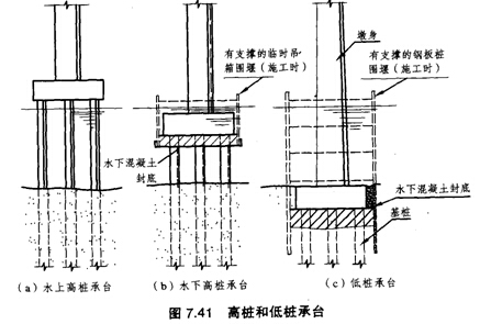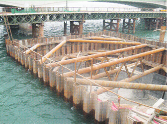 2.當(dāng)承臺(tái)位置位于水中時(shí),一般先設(shè)圍堰(鋼板樁圍堰或吊箱圍堰)將群樁圍在堰內(nèi),然后在堰內(nèi)河底灌注水下混凝土封底,凝結(jié)后,將水抽干,使各樁處于干處,再安裝承臺(tái)模板,在干處灌筑承臺(tái)混凝土。