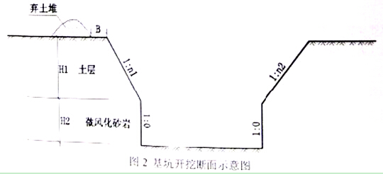 2.結(jié)合背景資料,說(shuō)明圖2中B的大小的要求,圖2中對(duì)微風(fēng)化砂巖開(kāi)挖坡度設(shè)為1:0是否正確?說(shuō)明理由。確定上層土層開(kāi)挖坡度時(shí)應(yīng)主要考慮哪些因素?