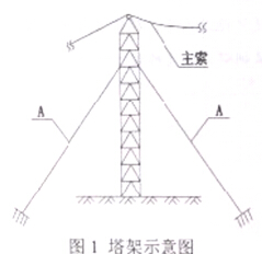 纜索吊裝系統(tǒng)主要由塔架、主索(承重索)、起吊索、牽引索、扣索、工作索、天車(滑輪索)、索鞍、錨碇等組成。塔架高度85m,采用鋼制萬(wàn)能桿件聯(lián)接組拼,塔架示意圖如圖1所示。