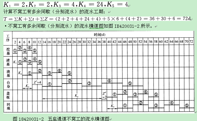 (3)有窩工且有多余間歇流水時(shí)的流水工期是兩者中最短的工期(即無多余間歇流水工期)=64d。