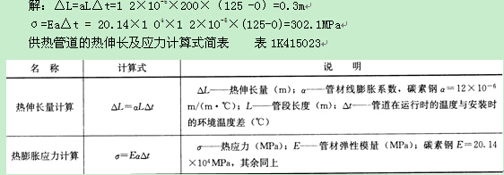 供熱管網(wǎng)的介質(zhì)溫度較高,供熱管道本身長度又長,故管道產(chǎn)生的溫度變形量就大,其熱膨脹的應(yīng)力也會很大。為了釋放溫度變形,消除溫度應(yīng)力;以確保管網(wǎng)運行安全,必須根據(jù)供熱管道的熱伸長量及應(yīng)力計算(計算式見表1K415023)設(shè)置適應(yīng)管道溫度變形的補償器。