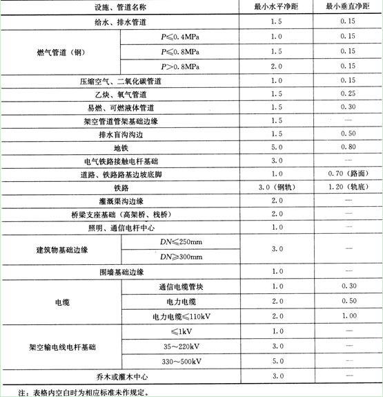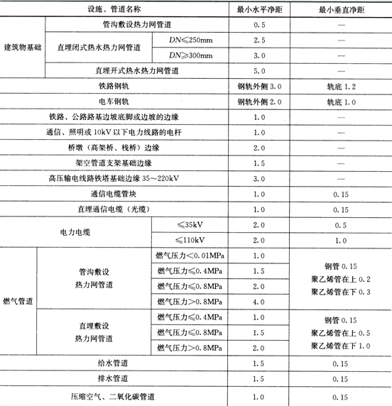 注:本表不包括直埋敷設(shè)蒸汽管道與建筑物、其他管線的凈距。