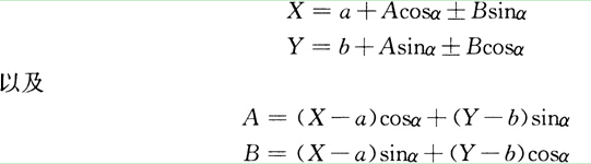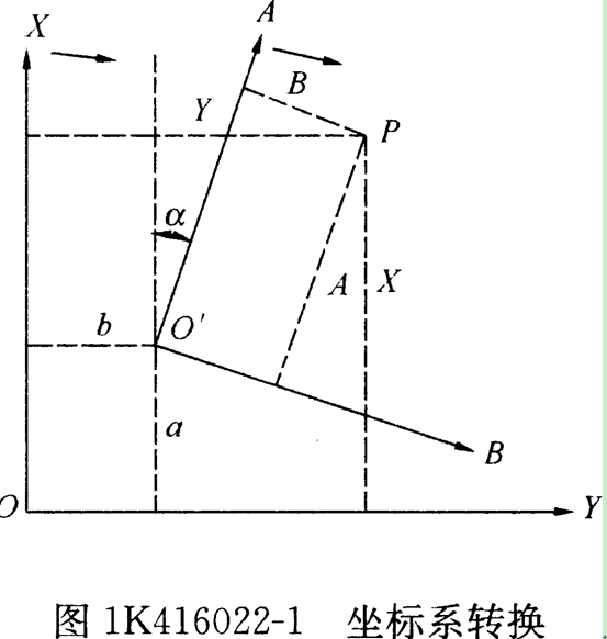 (4)當(dāng)施工控制網(wǎng)與測(cè)量控制網(wǎng)發(fā)生聯(lián)系時(shí),應(yīng)進(jìn)行坐標(biāo)換算,以便統(tǒng)一坐標(biāo)系;如圖1K416022―1所示,兩坐標(biāo)系的旋向相同,設(shè)A為施工坐標(biāo)系(AO'B)的縱軸OA在測(cè)量坐標(biāo)系(XOY)內(nèi)的方位角,坐標(biāo)系原點(diǎn)O'在測(cè)量系內(nèi)的坐標(biāo)值,則P點(diǎn)在兩坐標(biāo)系統(tǒng)內(nèi)的坐標(biāo)X,Y和A,B的關(guān)系式為: