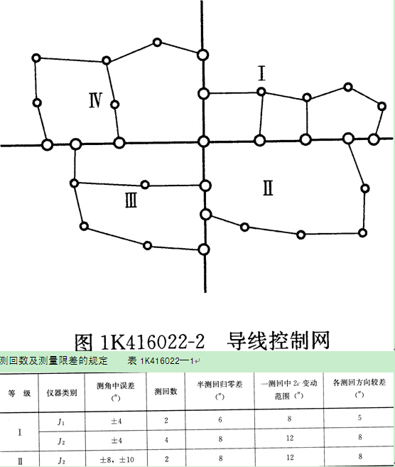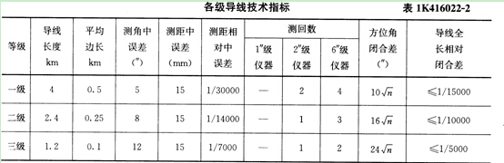 3)各級(jí)導(dǎo)線的總長(zhǎng)和邊長(zhǎng)應(yīng)符合表1K416022-2的有關(guān)規(guī)定。