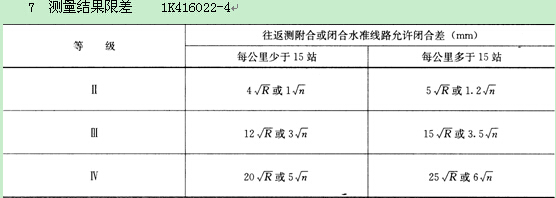 ?、颉ⅱ?、Ⅳ等水準(zhǔn)測(cè)量均應(yīng)進(jìn)行往返測(cè),或單程雙線觀測(cè),其測(cè)量結(jié)果應(yīng)符合表 1K416022-4的規(guī)定。