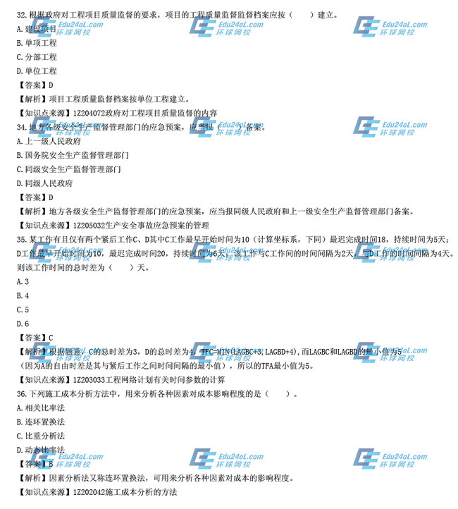 【摘要】一級建造師考試剛剛結束,各位考生一定非常關注本次考試的試題和參考答案等信息,環(huán)球網(wǎng)校一級建造師考試頻道為方便各位考生,特地為大家及時整理了本次一級建造師考試的真題,并附解析與參考答案,本文為2014年一級建造師《項目管理》真題解析(31-40),希望能夠對各位一級建造師考生有所幫助。更多復習資料及試題敬請關注環(huán)球網(wǎng)校一級建造師考試頻道,您可以按【ctrl鍵+D】手動收藏此頁面。
