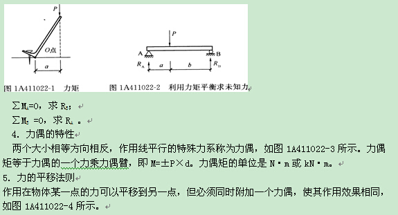 力使物體繞某點(diǎn)轉(zhuǎn)動(dòng)的效果要用力矩來(lái)度量。“力矩=力×力臂”,即M=P?a。轉(zhuǎn)動(dòng)中心稱力矩中心,力臂是力矩中心O點(diǎn)至力P的作用線的垂直距離a,見(jiàn)圖1A411022―1。力矩的單位是N?m或kN?m。