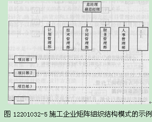 矩陣組織結(jié)構(gòu)是一種較新型的組織結(jié)構(gòu)模式。在矩陣組織結(jié)構(gòu)最高指揮者(部門(mén))下設(shè)縱向和橫向兩種不同類(lèi)型的工作部門(mén)?v向工作部門(mén)如人、財(cái)、物、產(chǎn)、供、銷(xiāo)的職能管理部門(mén),橫向工作部門(mén)如生產(chǎn)車(chē)間等。一個(gè)施工企業(yè),如采用矩陣組織結(jié)構(gòu)模式,則縱向工作部門(mén)可以是計(jì)劃管理、技術(shù)管理、合同管理、財(cái)務(wù)管理和人事管理部門(mén)等,而橫向工作部門(mén)可以是項(xiàng)目部(圖12201022-5)。