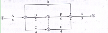 【解析】逆箭線方向推,計劃工期為2+3+4+4=13天,F(xiàn)的持續(xù)時間為4天,E持續(xù)時間為3天,所以13-4-3=6天。