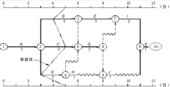 工程項目實際進度前鋒線是在時標網(wǎng)絡計劃圖上標示,為清楚起見,可在時標網(wǎng)絡計劃圖的上方和下方各設一時間坐標。