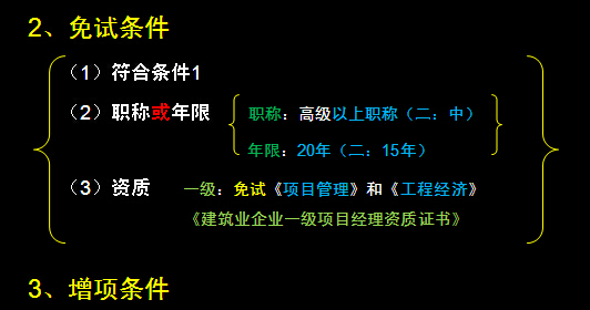 凡2003年12月31日前取得建設部頒發(fā)的《建筑業(yè)企業(yè)一級項目經(jīng)理資質證書》,并符合下列條件之一的人員,可免試《建設工程經(jīng)濟》和《建設工程項目管理》2個科目。