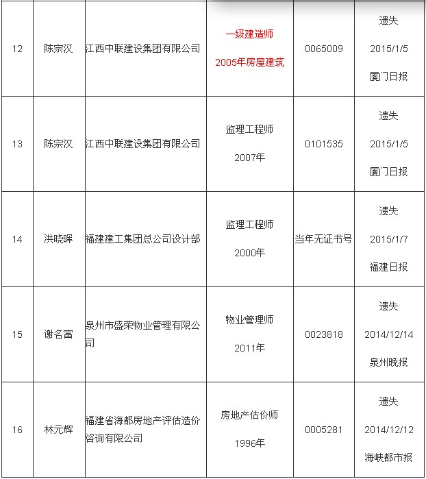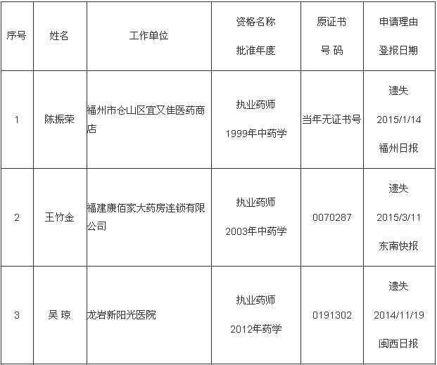 根據(jù)《關(guān)于更換補(bǔ)發(fā)專業(yè)技術(shù)資格證書有關(guān)問題的通知》,擬為陳振榮等十五位同志申請(qǐng)補(bǔ)辦專業(yè)技術(shù)資格證書,現(xiàn)予以公示。公示期間,如有異議,請(qǐng)及時(shí)向福建省人力資源和社會(huì)保障廳事業(yè)單位人事管理處反映。