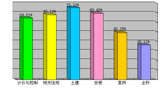 從歷年情況來看,造價工程師考試每年全科通過率都在10%左右,所有科目中《工程造價案例分析》的通過率最低,隨著考試的成熟,難度也愈漸加大。環(huán)球網校(www.edu24ol.com)2005年造價工程師考試輔導通過率情況為:《工程造價計價與控制》64.51%、《工程造價管理基礎理論與相關法規(guī)》68.13%、《建設工程技術與計量(土建)》75.32%、《建設工程技術與計量(安裝)》69.46%、《工程造價案例分析》49.25%,全科通過率36.11%。