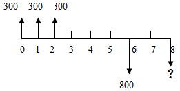 解這類(lèi)問(wèn)題,首先根據(jù)題目中表述的建設(shè)期、運(yùn)營(yíng)期以及年初、年末等畫(huà)出現(xiàn)金流量圖。之后拋開(kāi)這些描述的詞語(yǔ),只在圖上進(jìn)行分析,其中A折F,F(xiàn)應(yīng)在最后一個(gè)A的時(shí)間點(diǎn)上, A折P,P應(yīng)在第一個(gè)A的前一個(gè)時(shí)間點(diǎn)上。[300×(F/A,10%,3)×(F/P,10%,4)-800] ×(F/P,10%,2)=791.04 其中。[300×(F/A,10%,3)把現(xiàn)金流折到了2的時(shí)間點(diǎn)上,×(F/P,10%,4)又折算到了6的時(shí)間點(diǎn)上,在此時(shí)間點(diǎn)上-800。 之后×(F/P,10%,2)把累計(jì)的現(xiàn)金流折算到了8時(shí)間點(diǎn)上,即所要求的答案