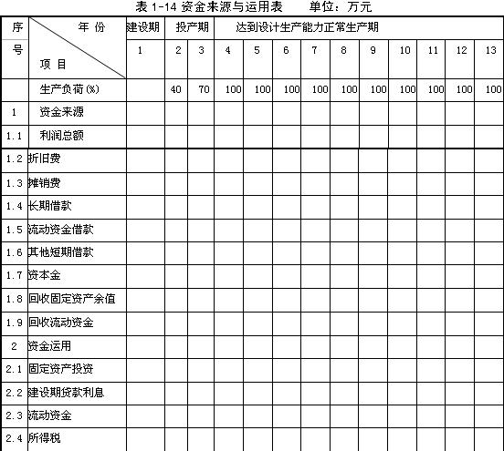 (4)按照表1-12給定的格式填寫(xiě)項(xiàng)目的資金來(lái)源與運(yùn)用表(表1-14),可根據(jù)需要設(shè)置其他短期借款,借款期為一年,按年末借款考慮,年利率10%。(注:該項(xiàng)貸款產(chǎn)生的利息可直接隨本金償還,不需考慮其對(duì)利潤(rùn)總額的影響。)