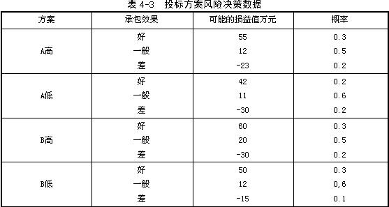 某施工公司欲在A(yíng)、B兩項(xiàng)公開(kāi)招標(biāo)工程中選擇一項(xiàng)進(jìn)行投標(biāo),對(duì)某項(xiàng)工程又可采取投高標(biāo)或投低標(biāo)兩種策略。根據(jù)以往經(jīng)驗(yàn)與統(tǒng)計(jì)資料,若投高標(biāo),中標(biāo)的概率為0.3;若投低標(biāo),中標(biāo)的概率為0.5。各方案可能出現(xiàn)的損益值及其概率估計(jì)見(jiàn)表4-3。不中標(biāo)的費(fèi)用損失為5 000元。
