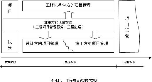 (2)工程項目管理的類型。在工程項目的策劃決策和建設(shè)實施過程中,由于各階段的任務(wù)和實施主體不同,從而構(gòu)成了不同類型的項目管理(如圖4.1.1所示),包括:業(yè)主方的項目管理(業(yè)主自身的項目管理、社會化的項目管理公司為業(yè)主提供的項目管理服務(wù)以及工程監(jiān)理單位為業(yè)主提供的監(jiān)理服務(wù))、工程總承包方的項目管理、設(shè)計方的項目管理、施工方的項目管理、供貨方的項目管理等。