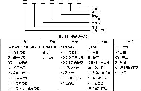 (—)電纜的型號表示法 電纜型號的內(nèi)容包含有:用途類別、絕緣材料、導(dǎo)體材料、鎧裝保護層等,電纜型號含義如表1.4.3所示,一般型號表示如下: