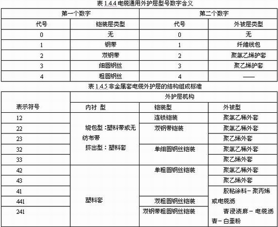 電纜如有外護層時,在表示型號的漢語拼音字母后面用兩個阿拉伯數(shù)字來表示外護層的結(jié)構(gòu)。其外護層的結(jié)構(gòu)按鎧裝層和外被層的結(jié)構(gòu)順序用阿拉伯數(shù)字表示,前一個數(shù)字表示鎧裝結(jié)構(gòu),后一個數(shù)字表示外被層結(jié)構(gòu)類型。電纜通用外護層和非金屬套電纜外護層中每一個數(shù)字所代表的主要材料及含義見表1.4.4和表1.4.5所示。