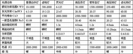 氣體放電光源一般比熱輻射光源光效高、壽命長,能制成各種不同光色,在電氣照明中應(yīng)用日益廣泛。熱輻射光源結(jié)構(gòu)簡單,使用方便,顯色性好,故在一般場所仍被普遍采用。常用照明電光源的主要特性比較見表5.4.2所示。