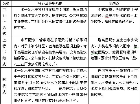 給水系統(tǒng)按給水管網(wǎng)的敷設(shè)方式不同,可以布置成下行上給式、上行下給式和環(huán)狀供水式三種管網(wǎng)方式。其主要優(yōu)缺點如下表所示