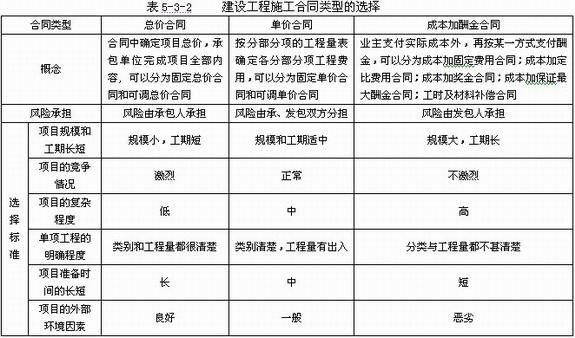 各種不同類型的合同有著各自的應用條件,合同各方的權利和責任的劃分是不同的,合同各方承擔的風險也不同,在實踐中應根據(jù)工程項目的具體情況進行選擇。合同類型的選擇,見表5-3-2。
