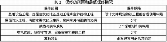 解析:本題考查保修費(fèi)用的處理,考核的關(guān)鍵是保修期限。根據(jù)我國(guó)《建設(shè)工程質(zhì)量管理?xiàng)l例》規(guī)定屋面防水工程、有防水要求的衛(wèi)生間、房間和外墻面的防滲漏為5年;供熱與供冷系統(tǒng)為2個(gè)采暖期和供冷期;電氣管線(xiàn)、給排水管道、設(shè)備安裝和裝修工程為2年。