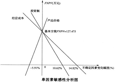 從圖示可知,其中每一條斜線的斜率反映經(jīng)濟(jì)評(píng)價(jià)指標(biāo)對(duì)該不確定因素的敏感程度,斜率越大敏感度越高。一張圖可以同時(shí)反映多個(gè)因素的敏感性分析結(jié)果。每條斜線與橫軸的相交點(diǎn)所對(duì)應(yīng)的不確定因素變化率即為該因素的臨界點(diǎn)。