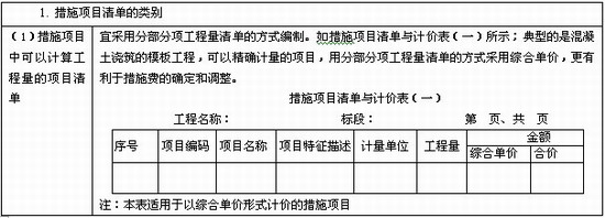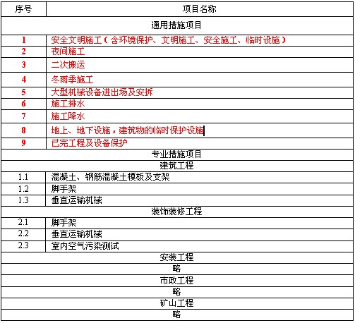 措施項目清單指為完成工程項目施工,發(fā)生于該工程施工前和施工過程中技術、生活、文明、安全等方面的非工程實體項目清單。措施項目清單應根據擬建工程的具體情況參照下表 列項。