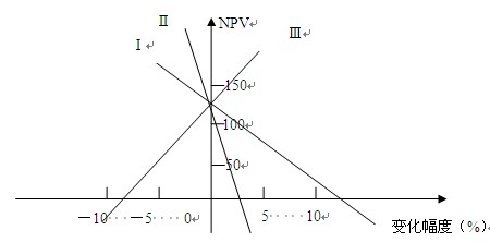 解析:該題考核的是不確定性因素的敏感度,采用的方法有兩種:1通過(guò)不同因素的直線斜率確定敏感度,斜率大者敏感;2通過(guò)比較不同因素的臨界點(diǎn)的絕對(duì)值,臨界點(diǎn)的絕對(duì)值小者敏感。根據(jù)這兩種方法,可以確定這三個(gè)不確定因素Ⅰ、Ⅱ、Ⅲ的敏感性從大到小的排列順序?yàn)棰?Ⅲ-Ⅰ。