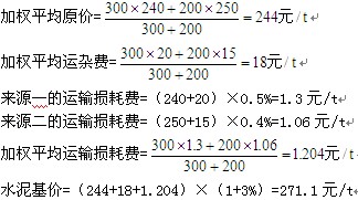 8.某工地水泥從兩個(gè)地方采購(gòu),其采購(gòu)量及有關(guān)費(fèi)用如下表所示,則該工地水泥的基價(jià)為( )元/噸。